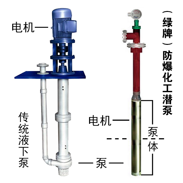 绿牌防爆化工潜泵与长轴液下泵比较示意图